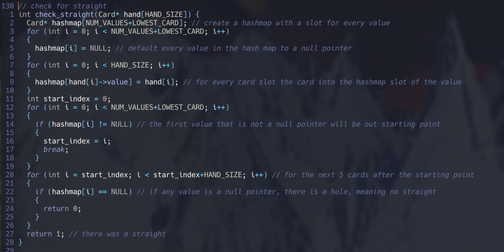 to check for straights I opted for a hash-map. The code first initializes the hash-map with null pointers. The hash function will be, the card is placed in the index corresponding with its value. This is fine since there are only 13 possibilities. Then the code checks for the first non-Null index. This is the start index. Finally we search the next 4 values after the start. If there are any null pointers there is no straight. Here’s the code: