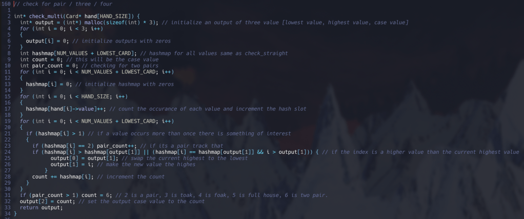For this code I also used a hash-map to count the occurrences of each value. the hash function is similar except I initialize the hash-map with zeros then increment the index of a value each time it appears in a hand. Then we create a count of every value that is greater than two. This count tells us the case. A count of 2 would be a pair, 3 is three of a kind, 4 is four of a kind, and 5 is a full house. We need to add an additional pair counter to differentiate between 4 being four of a kind or a two pair. Here’s the code: