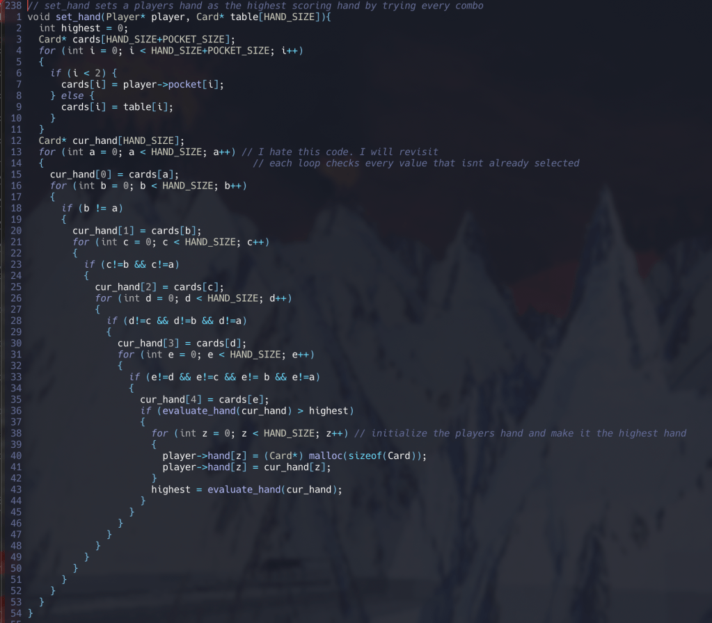 The code that I am least satisfied with is the function that sets the best hand. I struggled to find an efficient way to generate combinations. The challenge: selecting the best five-card hand from seven cards available(two in the pocket, five on the table) proved the be a big obstacle. I ended up choosing the only way I knew would work… A five level for loop. It’s really bad and as I work on the project I will keep it in the back of my head as a problem that needs reassessing. In spite of what my heart tells me, here’s the code: