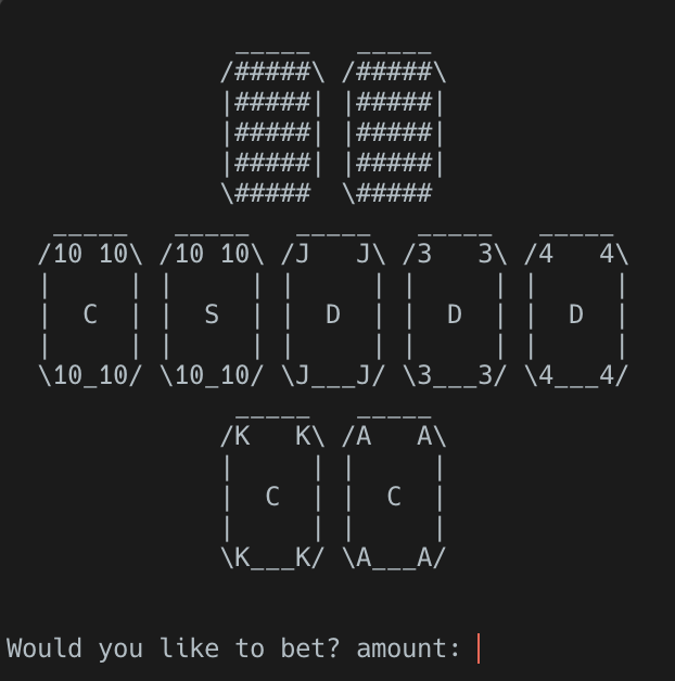 You might have noticed in the screenshot above, there’s a new gameplay element… Betting! Poker wouldn’t be as fun without stakes. The fist element of betting is a persistent balance for all players. This was easy to implement as a int attribute in the player struct. Next is placing bets. I made a function that asks for a bet and then checks if the player has enough money. The player is stuck in a while loop until they enter a valid amount.