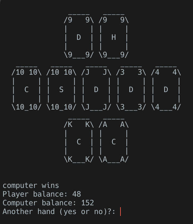 The game module contains all the functions that interface with the player and the play_hand function. The play hand function is looped until the player says they don’t want to play anymore. The play_hand function contains shuffling, dealing, betting, evaluating. It is a Frankenstein(‘s monster) of all the different functions and modules throughout the project. It doesn’t read very well and there is some repeated code.
